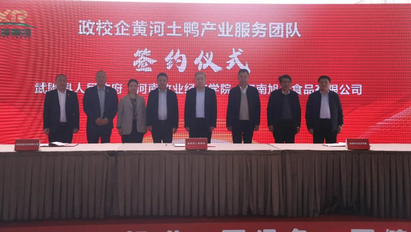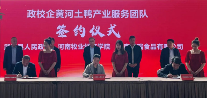 武陟縣政府副縣長蘇瑞君、河南牧業(yè)經(jīng)濟學院副校長楊國宇、河南旭瑞食品有限公司副總經(jīng)理邱國平為政校企三方共建“黃河土鴨”產(chǎn)業(yè)服務團隊簽約。三方將共同構(gòu)建“政府+產(chǎn)業(yè)服務團隊+龍頭企業(yè)”服務合作模式,推動產(chǎn)科教融合發(fā)展。同時,河南牧業(yè)經(jīng)濟學院將授予我們“百名專家助百村(企)工程服務基地”和“博士工作站”兩塊響亮的牌子,由12名專業(yè)博士為集團提供的技術創(chuàng)新支持。