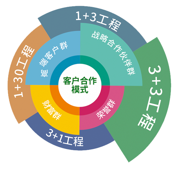 創(chuàng)新打造出獨(dú)特的“133-130”工程,圍繞(1+3工程、3+3工程、3+1工程、1+30工程)與客戶群(客戶群、財(cái)富群,榮譽(yù)群、戰(zhàn)略合作伙伴群等)兩大基點(diǎn)構(gòu)建系統(tǒng)化合作模式,建構(gòu)市場合作伙伴,服務(wù)客戶,為企業(yè)發(fā)展保駕護(hù)航。
